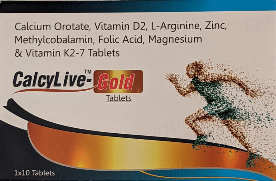 Introducing CalcyLive-Gold Tablets, the gold standard in bone health and vitality support. Each tablet is meticulously formulated with a potent blend of Calcium Orotate, Vitamin D2, L-Arginine, Zinc, Methylcobalamin, Folic Acid, Magnesium, and Vitamin K2-7, fortified with essential vitamins and minerals. Calcium Orotate, a highly bioavailable form of calcium, supports bone density and strength, while Vitamin D2 aids in calcium absorption, ensuring optimal bone health. L-Arginine promotes circulation and cardiovascular health, while Zinc and Methylcobalamin contribute to overall well-being. With the addition of Folic Acid, Magnesium, and Vitamin K2-7, CalcyLive-Gold Tablets provide comprehensive support for your skeletal system and overall vitality, empowering you to live life to the fullest.