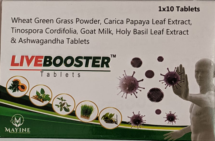 Introducing LIVEBOOSTER Tablets, your comprehensive support for immune system fortification and overall vitality. Crafted with a blend of potent ingredients including Wheat Green Grass Powder, Carica Papaya Leaf Extract, Tinospora Cordifolia, Goat Milk, Holy Basil Leaf Extract, and Ashwagandha, these tablets are designed to bolster your body’s natural defenses and promote holistic wellness. Wheat Green Grass Powder and Carica Papaya Leaf Extract provide a rich source of essential nutrients and antioxidants, supporting immune function and overall health. Tinospora Cordifolia, known for its immunomodulatory properties, works to enhance the body’s resistance to infections. Goat Milk offers a natural source of vitamins and minerals, while Holy Basil Leaf Extract and Ashwagandha help combat stress and promote mental well-being. Elevate your immune health and vitality with LIVEBOOSTER Tablets, your key to staying strong, resilient, and vibrant every day.